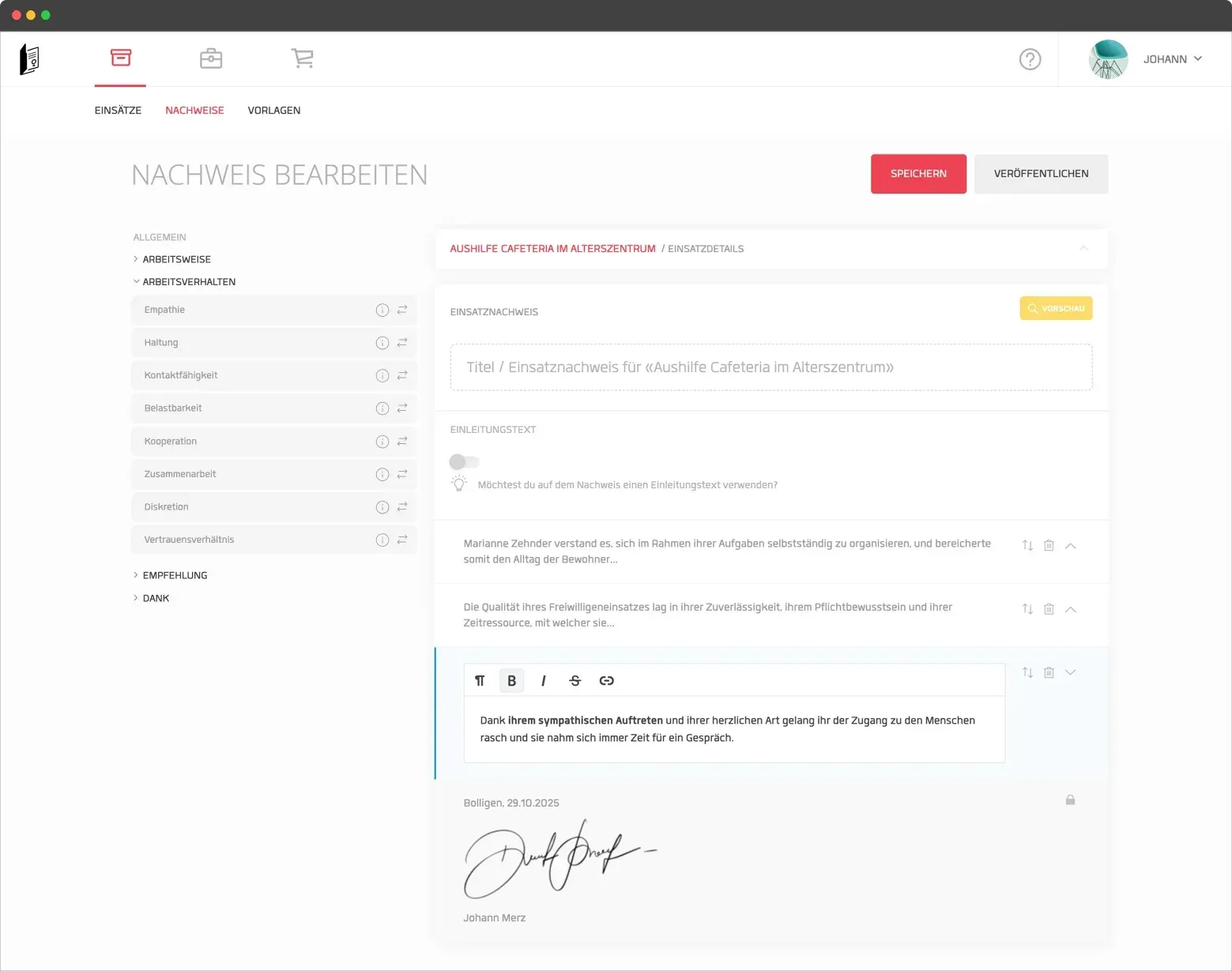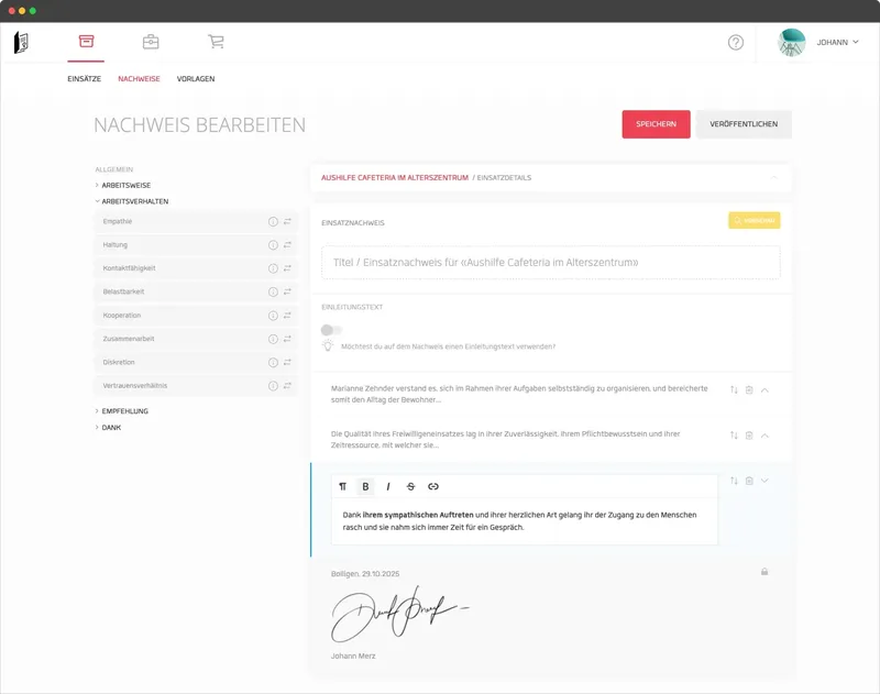 Plattform zur Erstellung von Arbeitsnachweisen für freiwillig engagierte Personen.