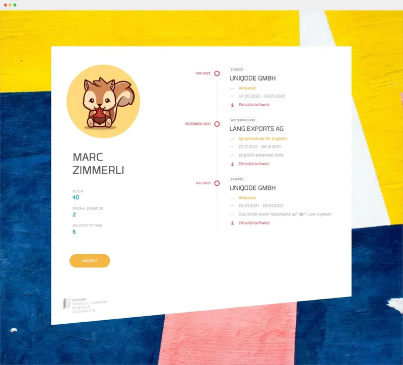 Volunteers können über ihr Konto das Timeline-Profil gestalten und öffentlich aufschalten. Darin werden automatisch alle bestätigten Einsätze gelistet. Eine granulare Einstellung über die zugänglichen Informationen ist möglich.